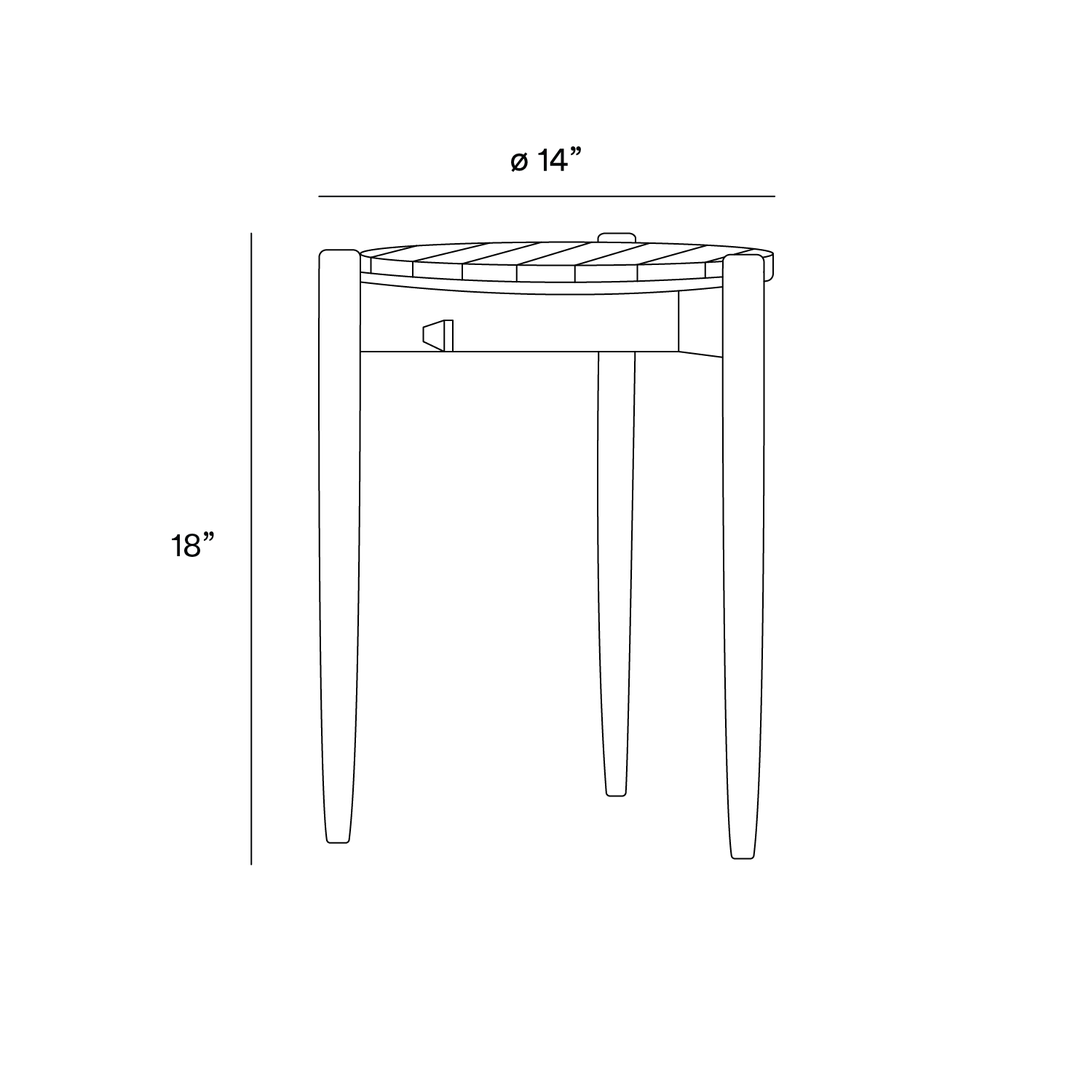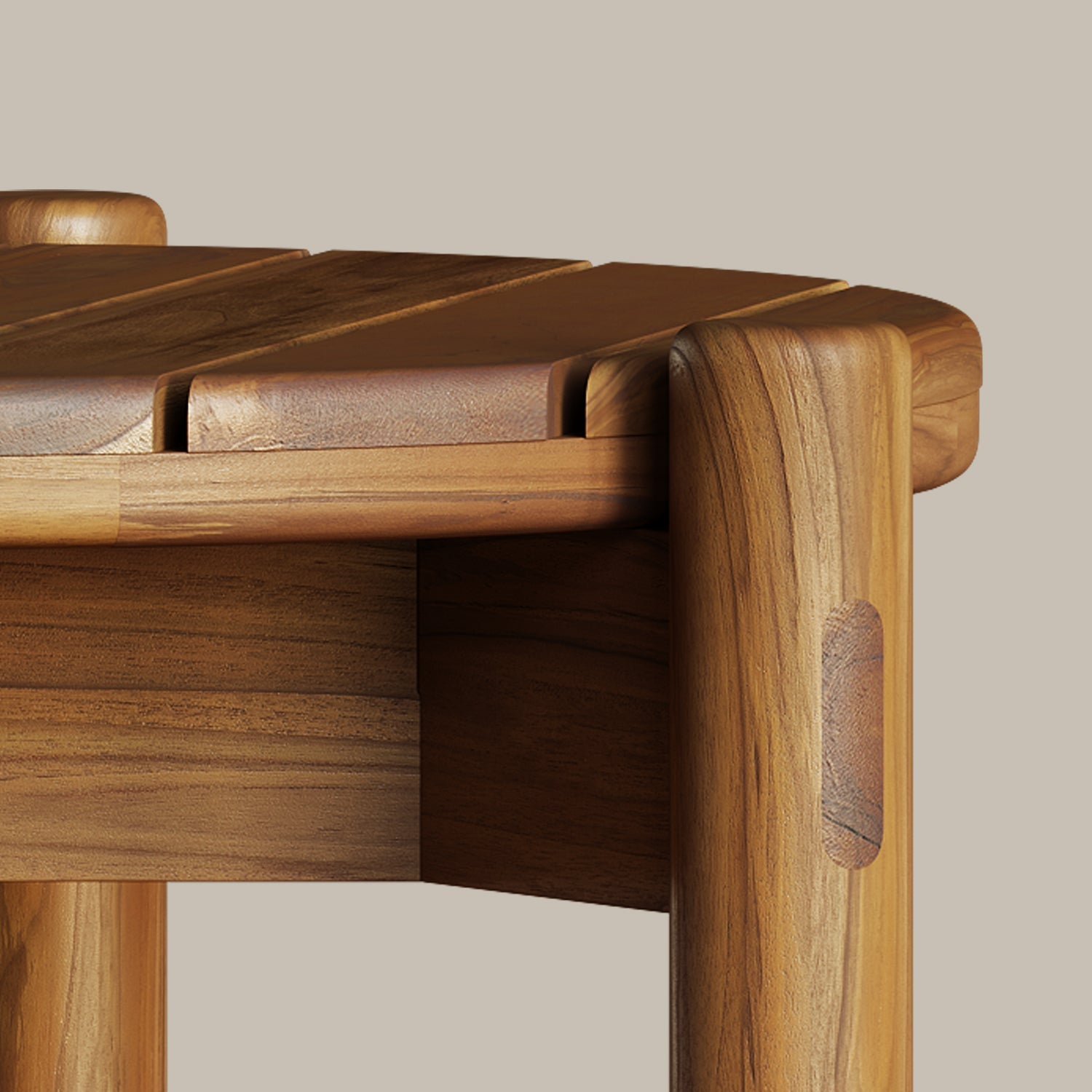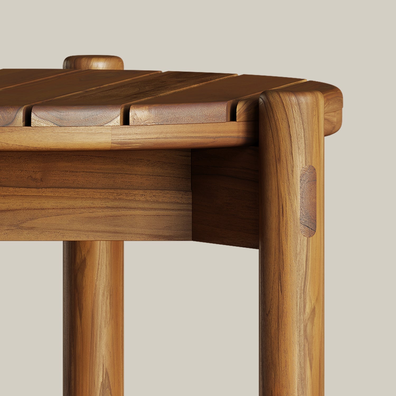 The Telica Stacking Side Table, handcrafted from solid teak, features a slatted top to prevent moisture pooling. Perfect for outdoor gatherings, it can be stacked and stored when not in use.