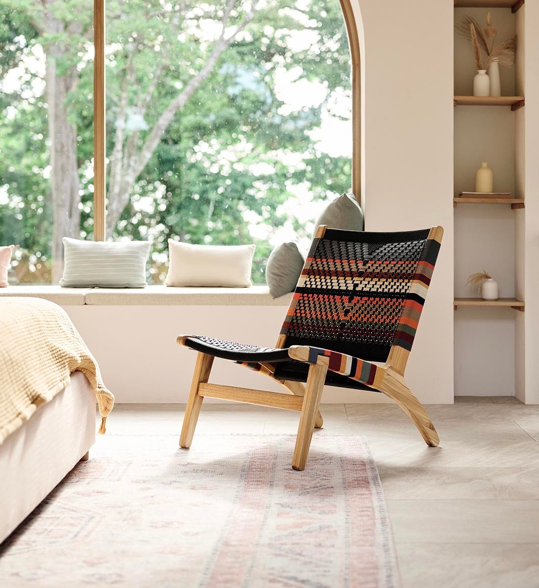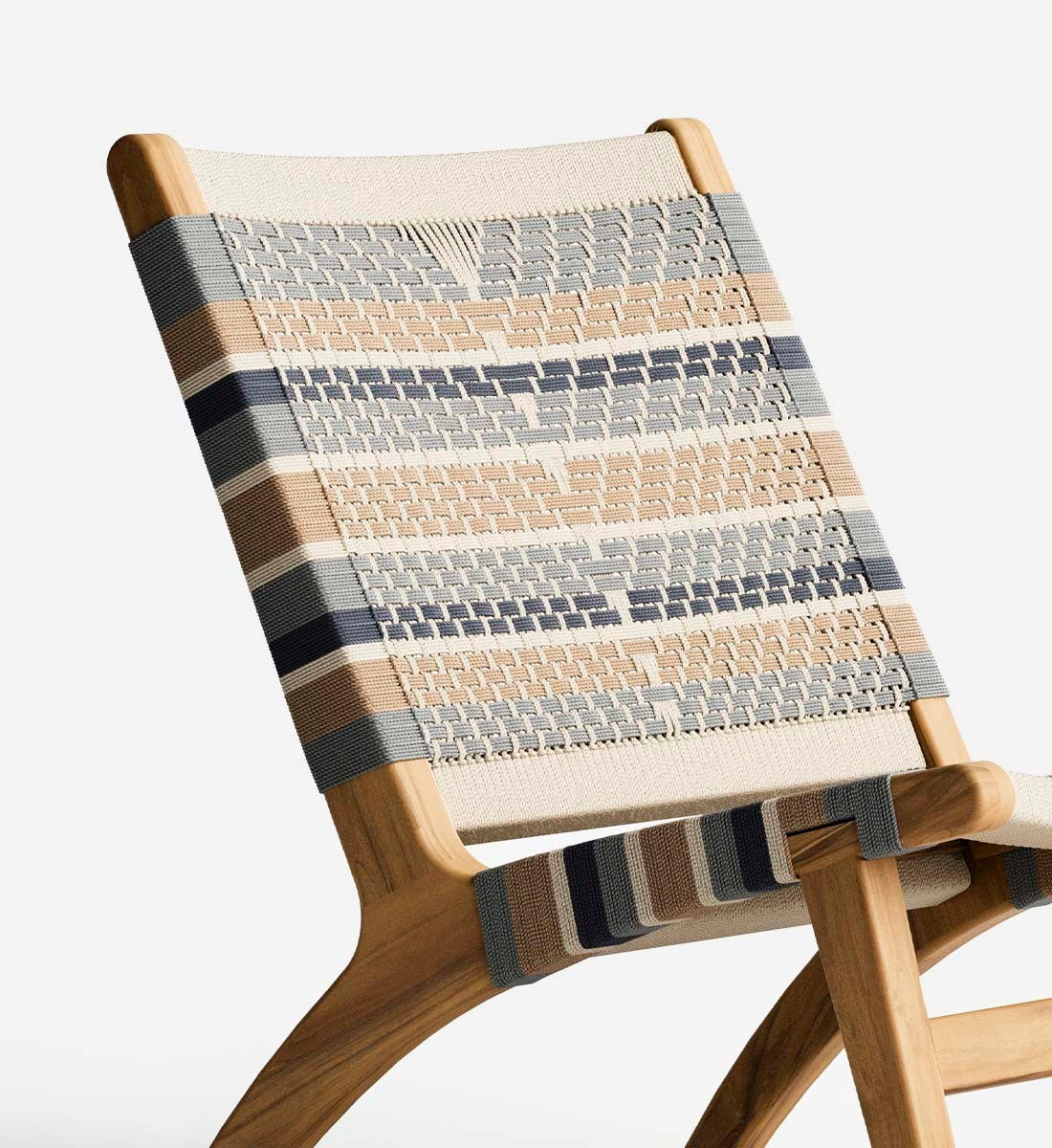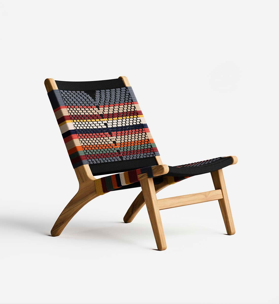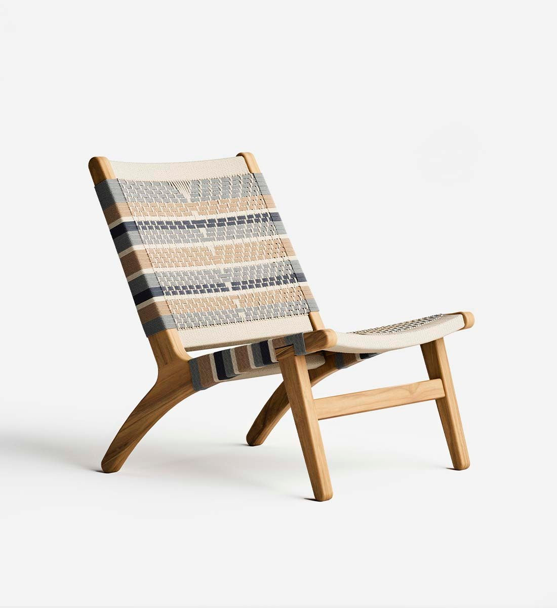 The Masaya Lounge Chair features a woven rope back and seat, inspired by Mid-Century Danish Cord and Japandi designs. Each piece is handmade from solid FSC® Certified teak wood and woven by hand using durable homespun polyester cord.