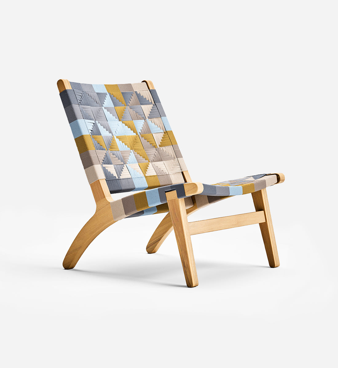 The Masaya Lounge Chair Sienna Pattern features a woven rope back and seat, inspired by Mid-Century Danish Cord and Japandi designs. Pattern by Martēn Design.