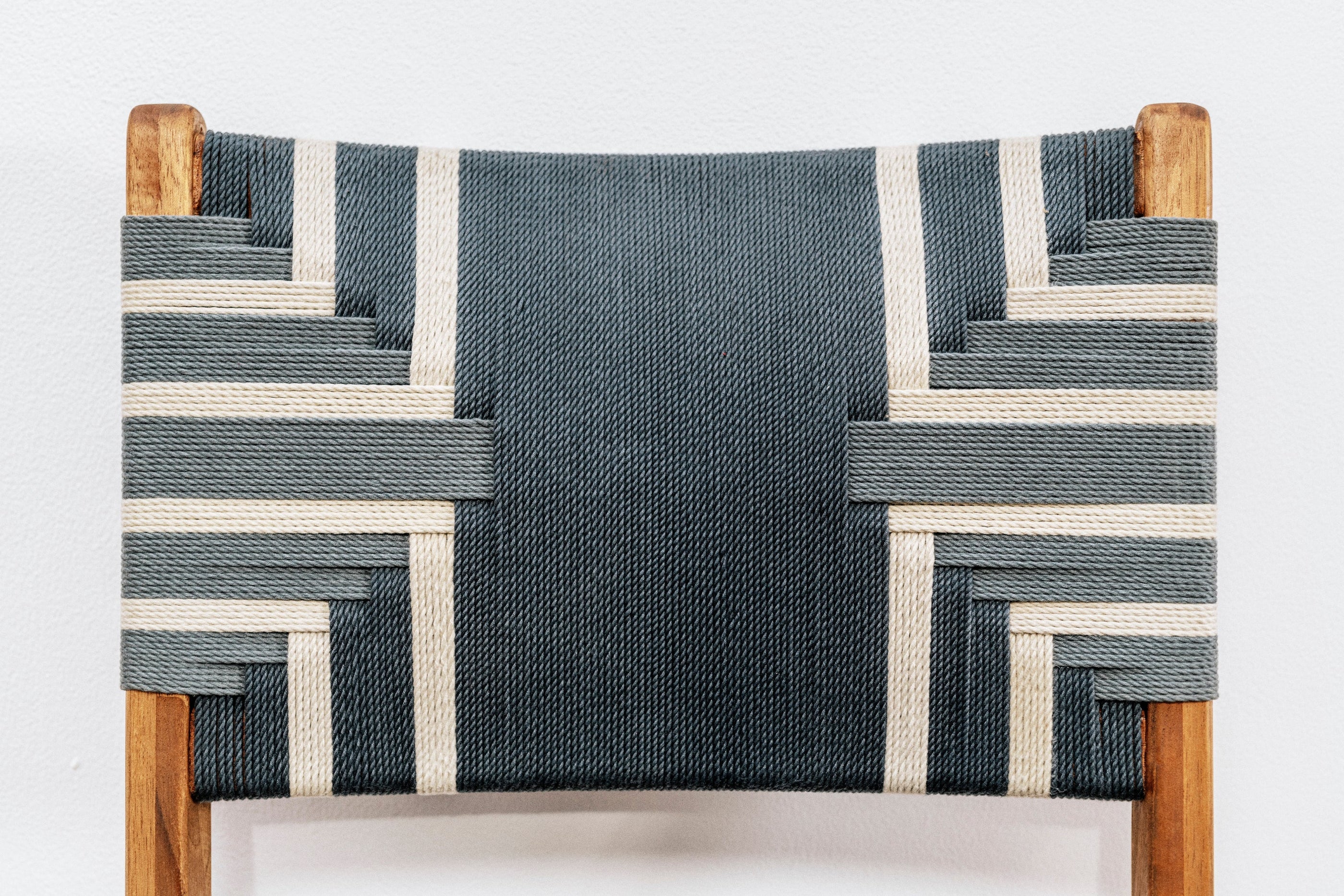 Nuestro patrón Balance es un patrón geométrico que presenta tonos de azul y gris. Este patrón tejido a mano traerá una sensación de paz y calma a tu espacio.