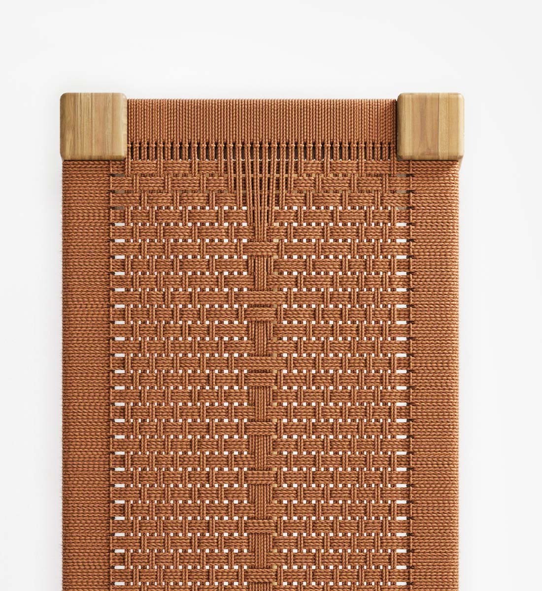 The Amador Dining Chair is handmade from reforested teak. Its gentle curves and intricate textures reflect a love for design and eco-conscious living.