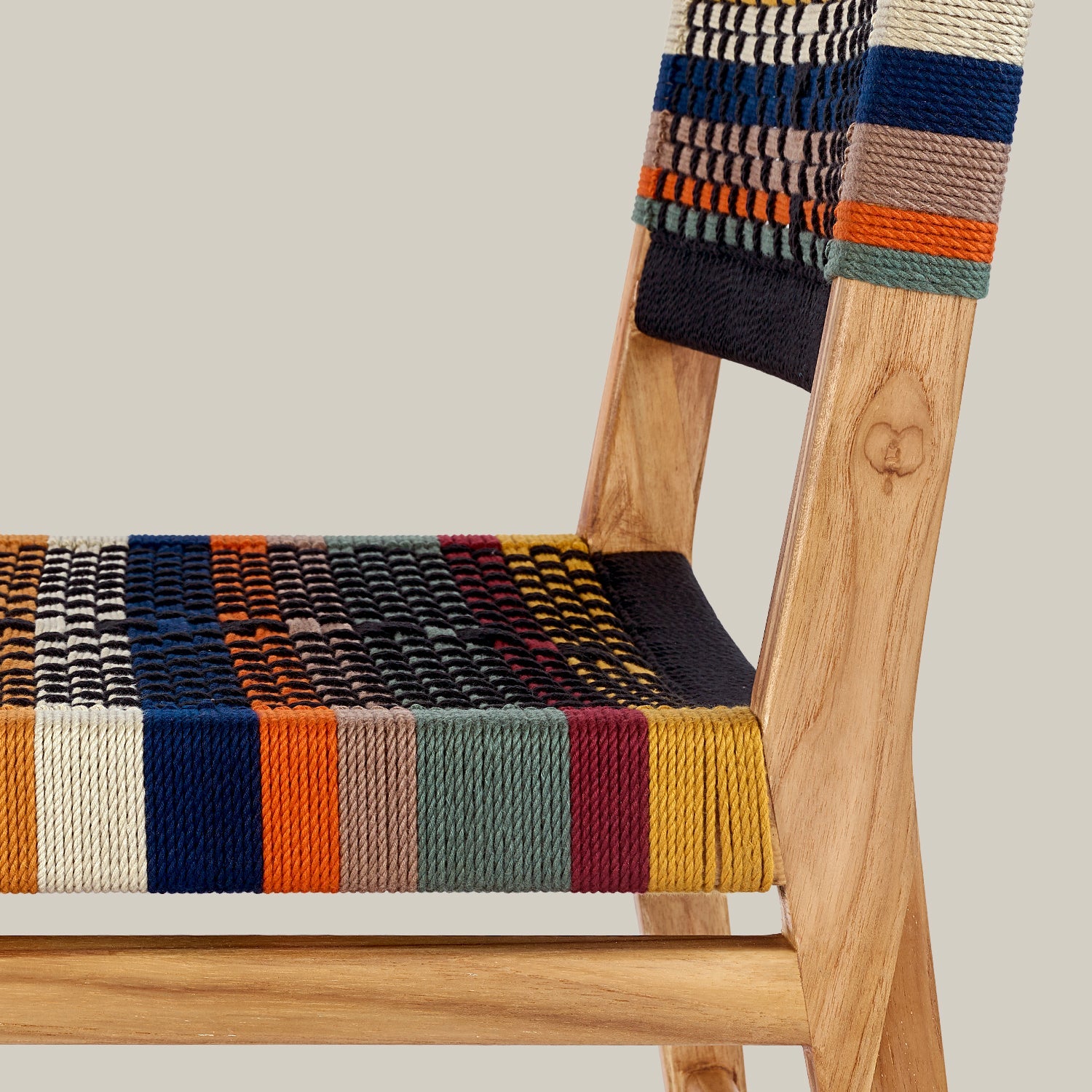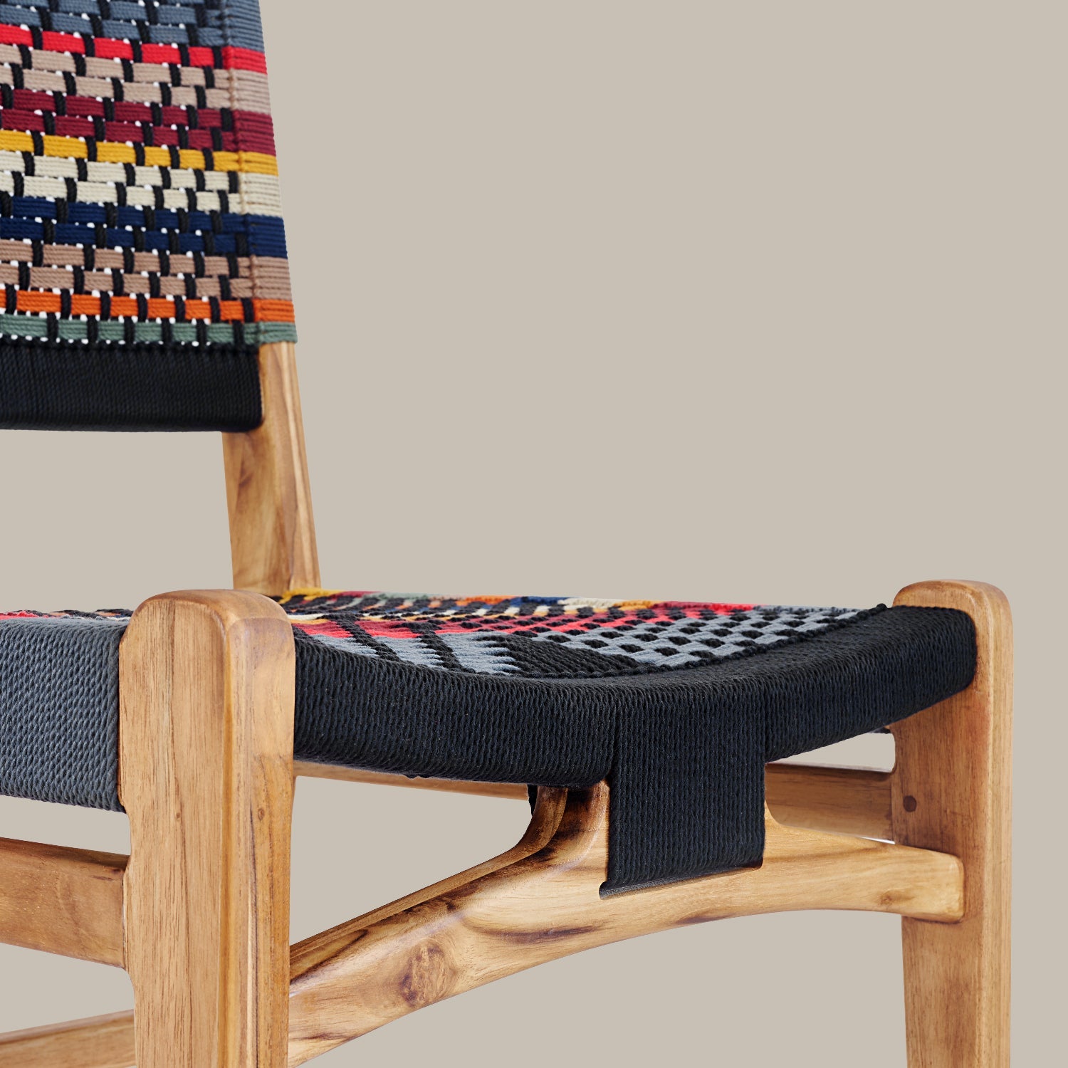 Diseñado para acentuar mesas de comedor modernas. El San Geronimo cuenta con una estructura de madera y un asiento y respaldo tejidos a mano. Disponible en una variedad de colores sólidos y patrones.