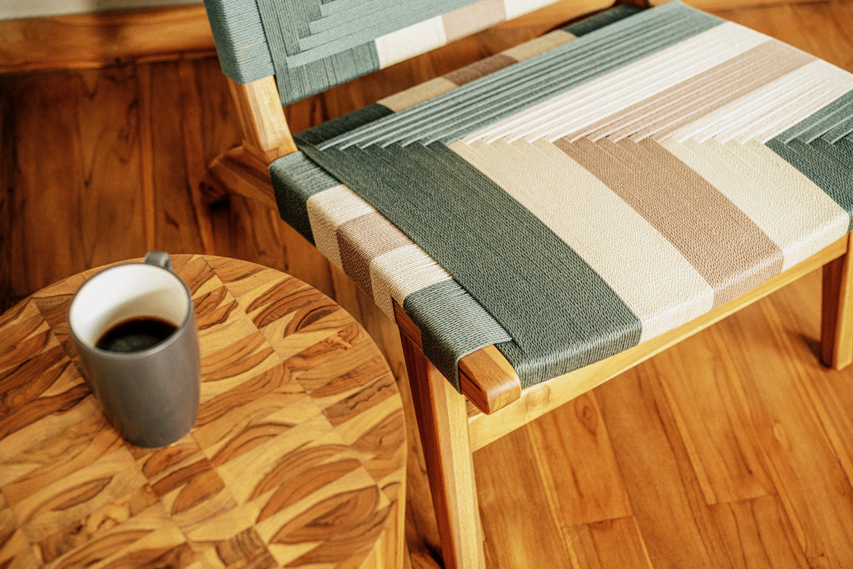 Los tonos tierra del patrón Mojito añaden un toque de tranquilidad a cualquier habitación. Los colores relajantes de su asiento y respaldo tejidos a mano complementan cualquier espacio.