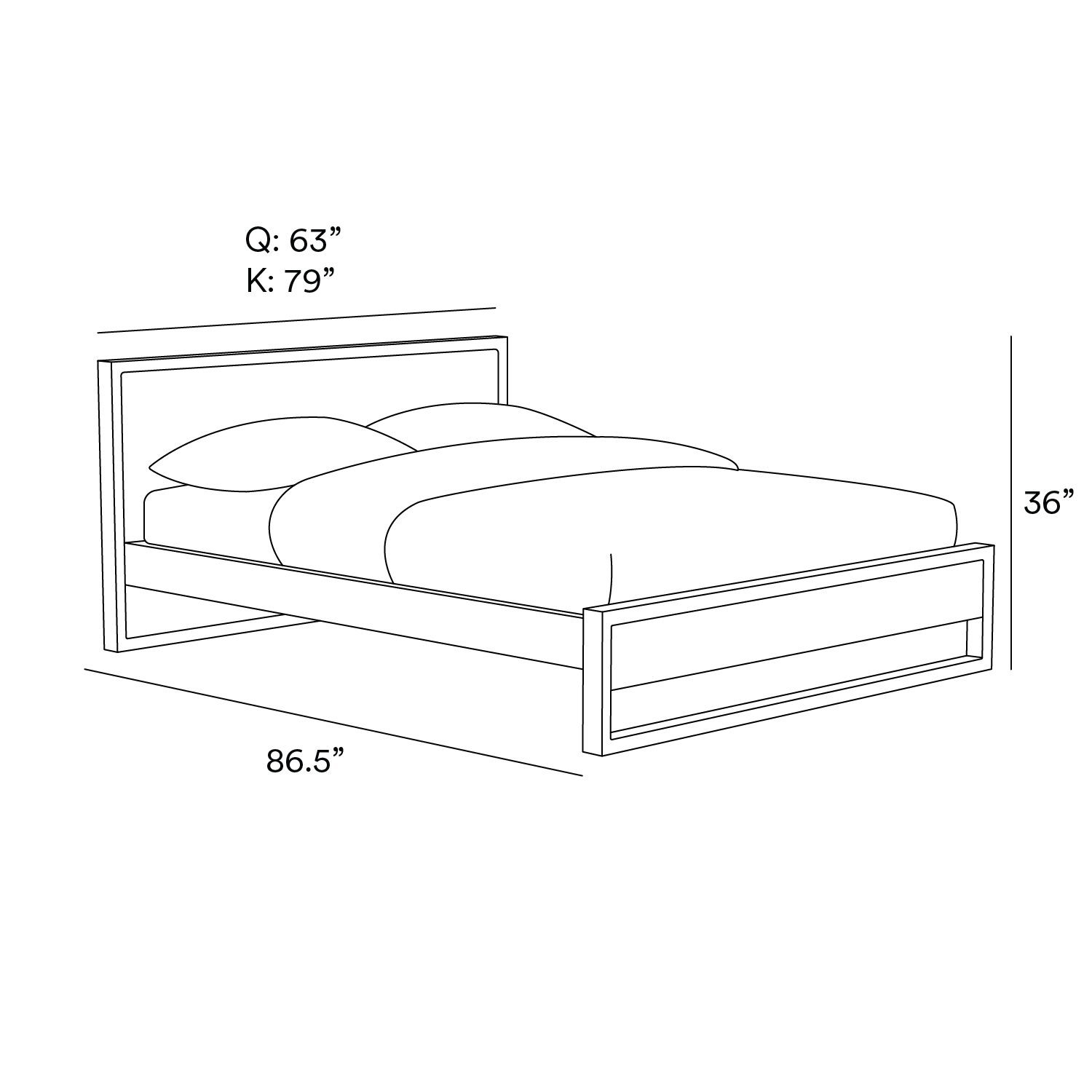 Reina: Ancho: 63" Fondo: 86.5" Alto: 36"